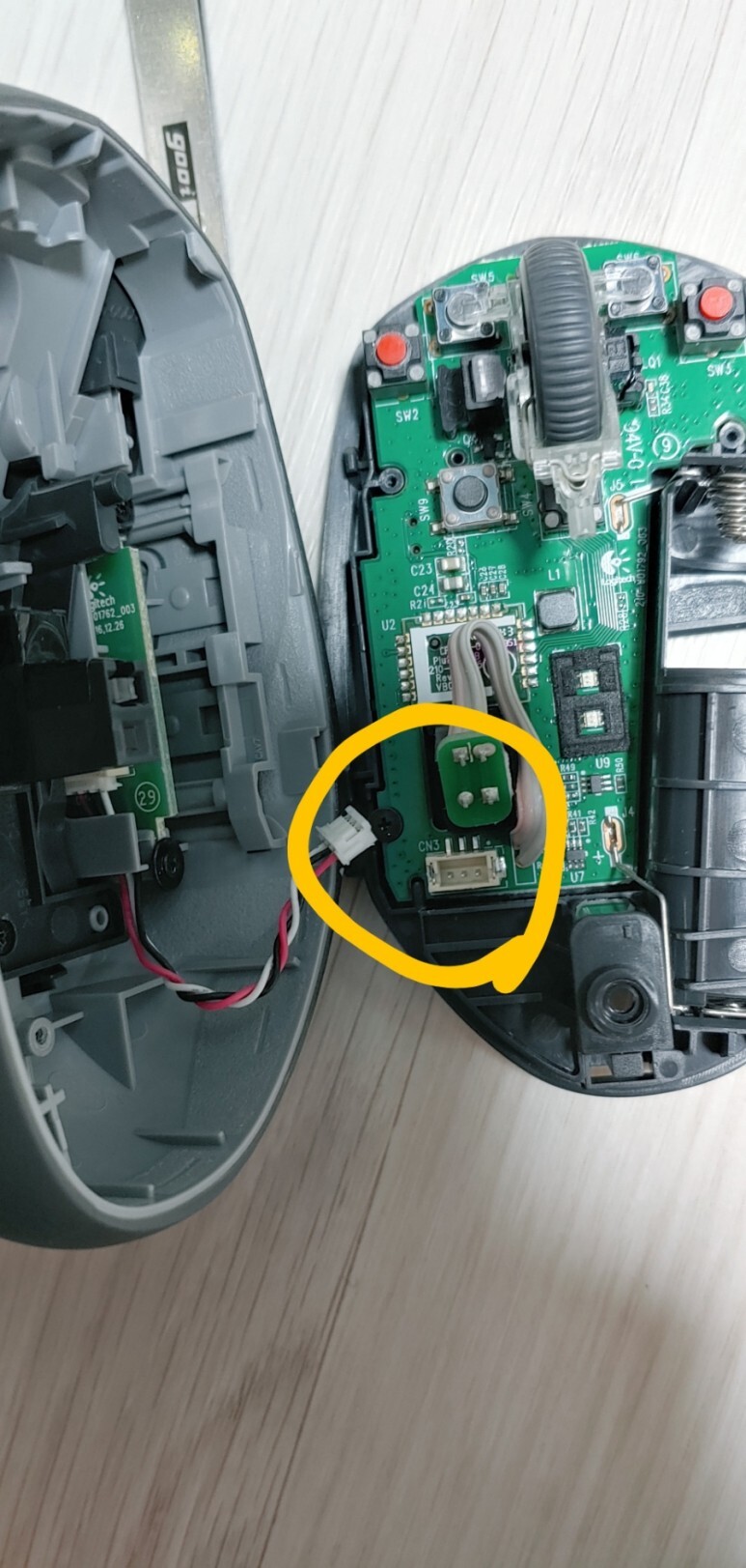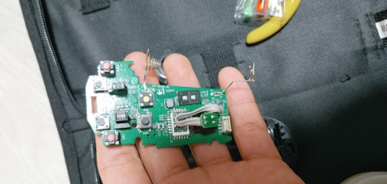 기판과 마우스 바텀 프레임과의 나사를 분해하고 살살빼주면 빠진다.